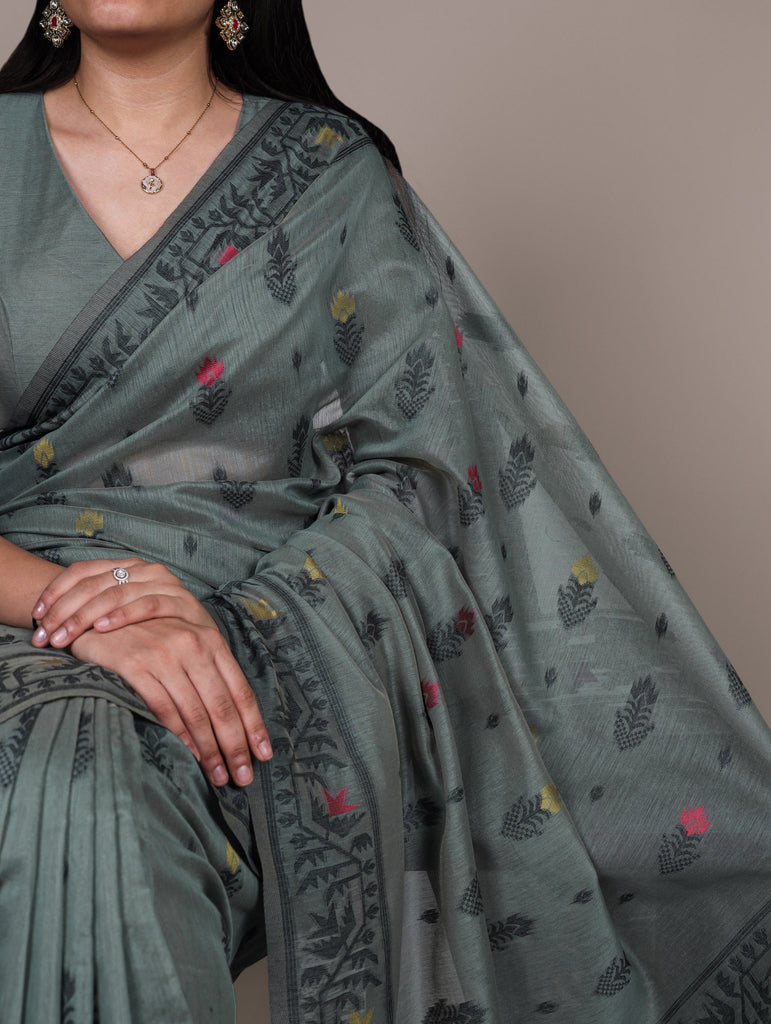 Dusty Fair Green Elegant Poly Cotton Thread-Weaving Saree with Matching Unstitched Blouse – Lightweight Traditional Daily & Festive Wear