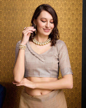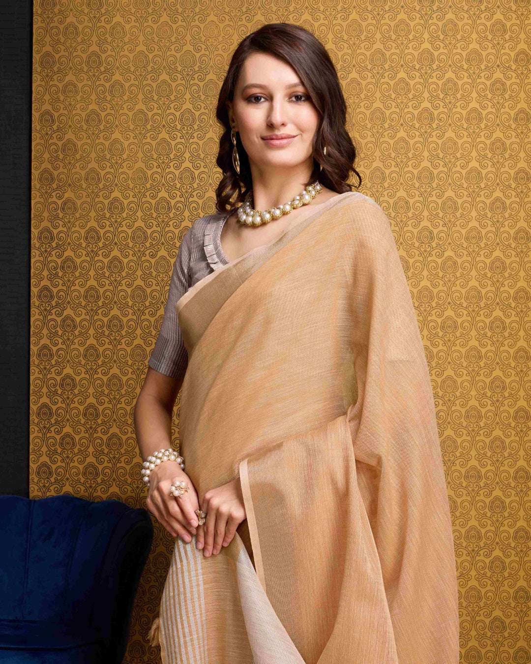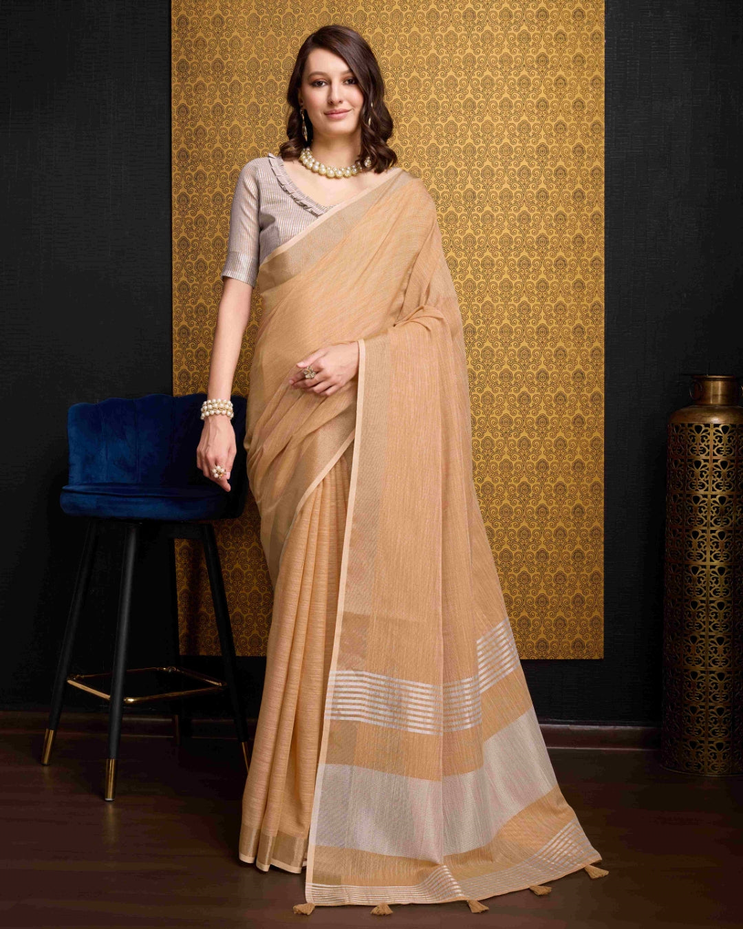 s elegant solid-colored saree, beautifully enhanced with a shimmering zari border. Designed for effortless grace, this saree is crafted from a premium linen blend, offering a luxurious feel with a touch of tradition. The intricate zari detailing adds a festive charm, making it perfect for special occasions.