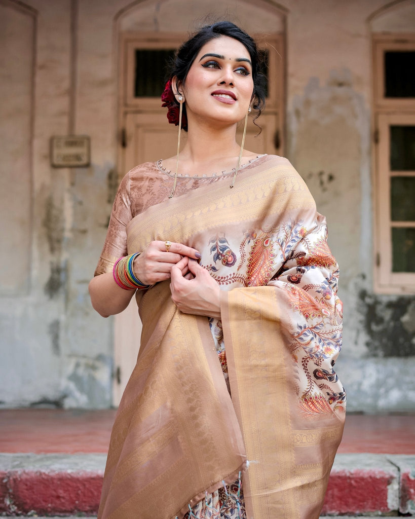 Elegant Beige Floral Banarasi Silk Saree with Zari Weave and Tassels