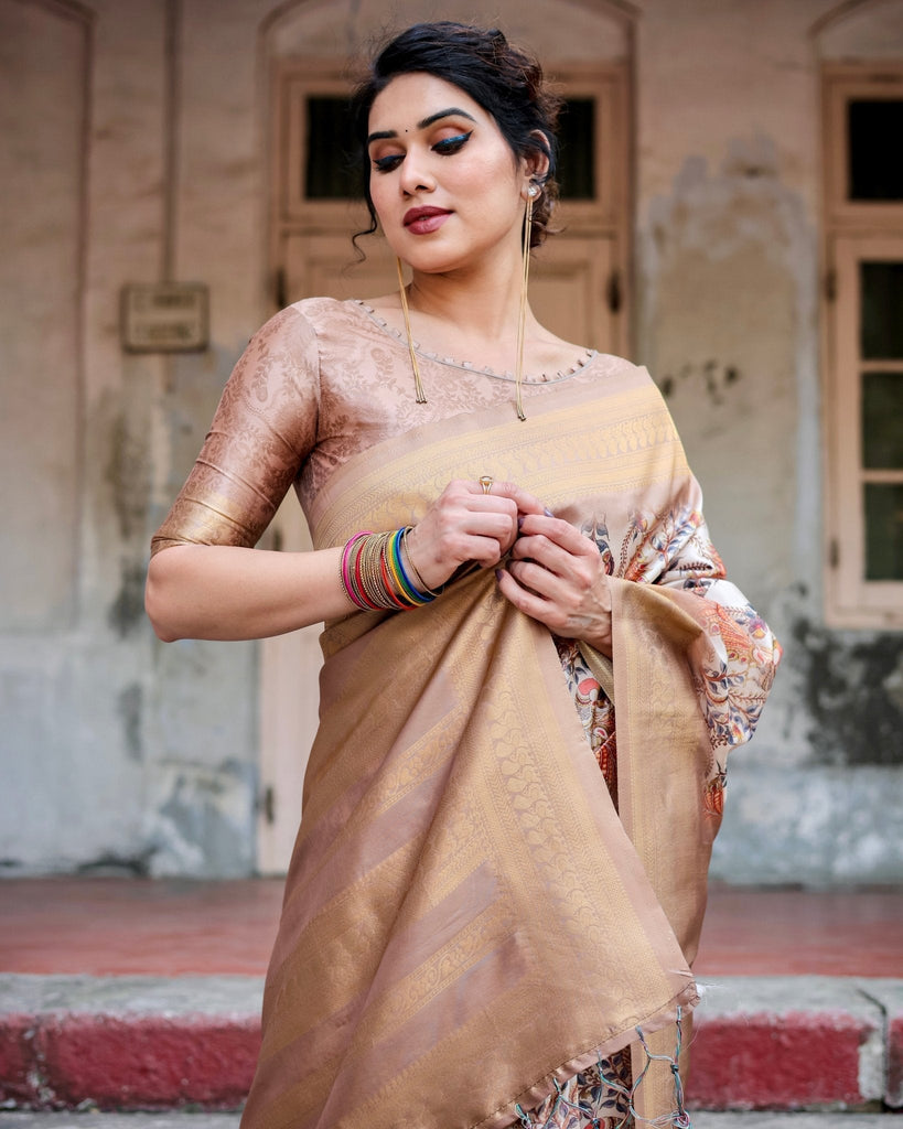 Elevate your ethnic collection with this pure Banarasi digitally printed silk saree, a masterpiece that seamlessly blends traditional artistry with modern sophistication.