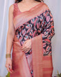 Step into elegance with this luxurious Banarasi silk saree, featuring a striking black base adorned with intricate peach leaf motifs. The saree is accentuated by a peach-hued pallu and border, showcasing delicate traditional patterns with a modern twist. The soft and smooth fabric ensures comfort while exuding sophistication. Complete with intricately crafted tassels, this saree is perfect for festive occasions, weddings, or cultural celebrations. Pair it with statement jewelry to create a lasting impression.
