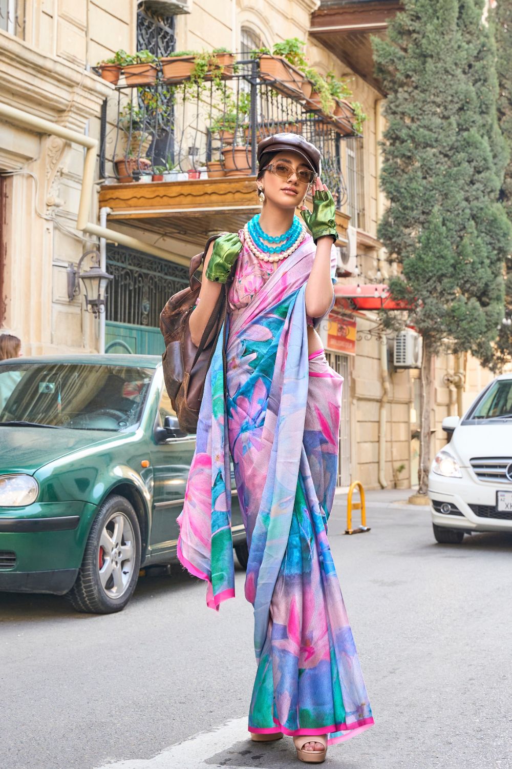Bollywood-style printed satin saree. Crafted from premium-quality satin, this saree offers a luxurious drape and an elegant sheen, ensuring you stand out in every gathering.