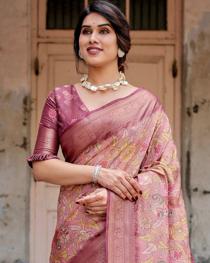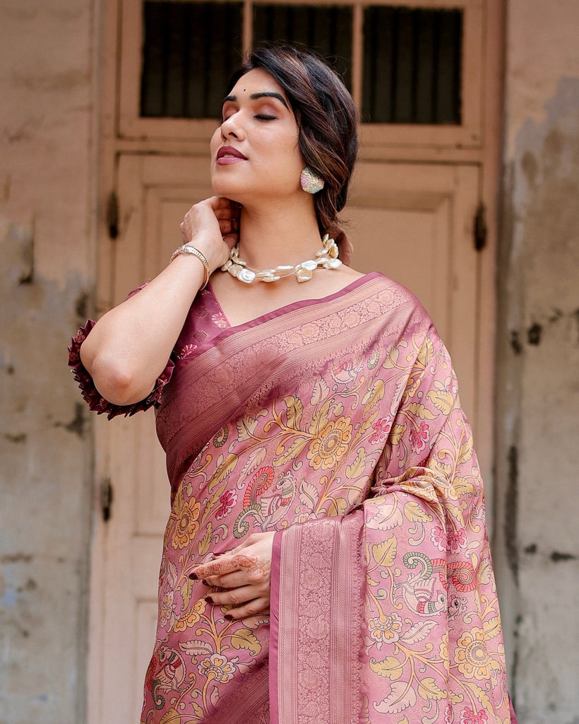Enhance your ethnic wardrobe with this exquisite pink Banarasi silk saree, featuring intricate floral zari weaving across the body. The saree is adorned with a beautifully crafted pallu showcasing traditional patterns and accented with elegant tassels for a touch of sophistication. Made from premium Banarasi silk, this saree offers a luxurious drape and a timeless appeal. Perfect for weddings, festive occasions, and grand celebrations, this masterpiece is a blend of tradition and elegance.