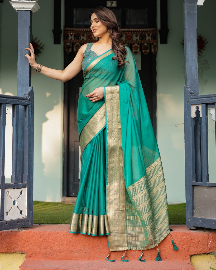 Elegant Sea Green Plain Chiffon Saree with Gold Zari Border, Paisley Printed Blouse & Tassel Detailing