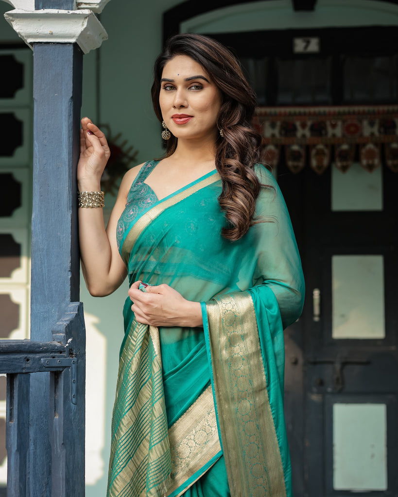 Add a splash of elegance to your ethnic wardrobe with this sea green plain chiffon saree, a perfect blend of sophistication and charm. Featuring a rich gold zari border, intricately detailed with floral and geometric motifs, this saree exudes timeless beauty. The lightweight chiffon fabric ensures a graceful drape, making it ideal for festive celebrations, weddings, or evening parties.