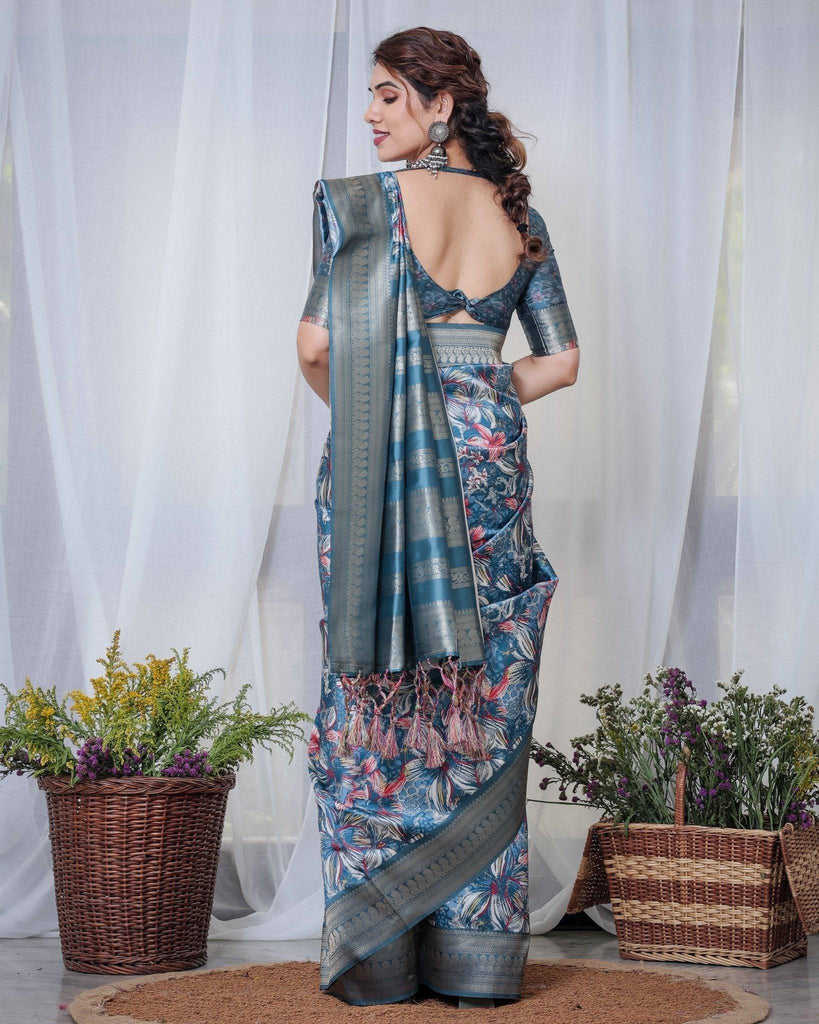 Elevate your wardrobe with this exquisite Banarasi digitally printed silk saree, featuring a vibrant ocean blue base adorned with intricate floral patterns. The luxurious zari weaving along the borders and pallu adds a touch of sophistication, while the tassel detailing enhances its timeless appeal. Perfect for festive occasions and weddings, this saree embodies grace and tradition with a modern flair. Pair it with statement jewelry to complete your elegant ensemble.