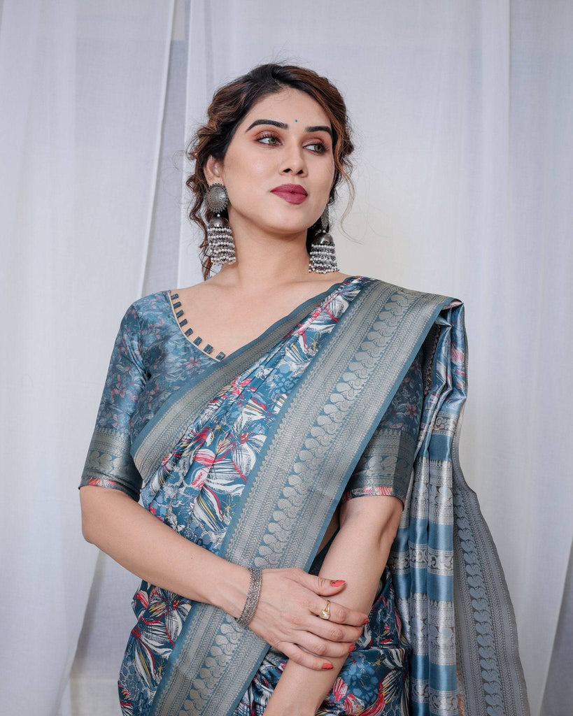 Elevate your ethnic collection with this pure Banarasi digitally printed silk saree, a masterpiece that seamlessly blends traditional artistry with modern sophistication.