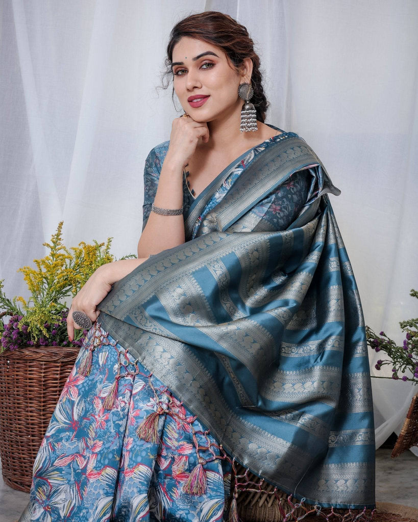 Enchanting Blue Banarasi Silk Saree with Multicolor Floral Weaves and Luxurious Zari Pallu with Tassels