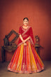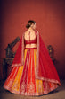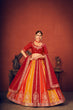 • The Lehenga Is Made From A Set Of Three Colors Of Red, Orange And Yellow, The Lehenga Is In Semi Stitched Form With Cancan Layered Net Attached That’s Why It Can Be Fit Up To 42 Inch Waist And 42 Inch Height With 3.5 Mtr Flare. It’s Worked With Sequins With Thread Embroidery;