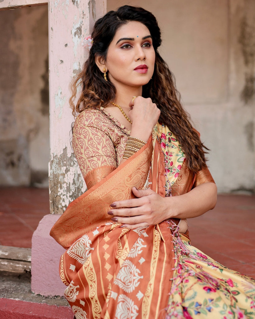 Golden Beige Tussar Silk Saree with Floral Paradise Print and Ornate Zari Border