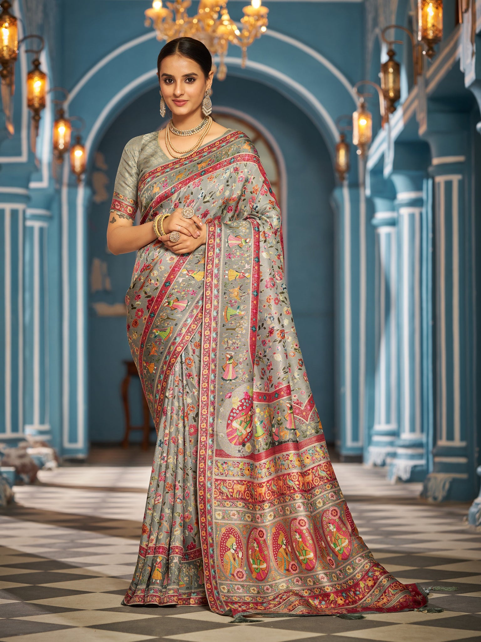 Gray Elegant Pashmina Kashmiri Jacquard Saree with Kalamkari & Meenakari Weaving