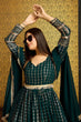 Look stunning in this beautiful green Anarkali long gown (KF-5001), perfect for any party or special occasion. The gown features a flattering Anarkali silhouette with intricate metallic foil work on the faux georgette fabric. It comes with a matching faux georgette dupatta featuring lace detailing on the border and a silk crepe inner lining for added comfort.