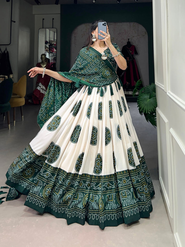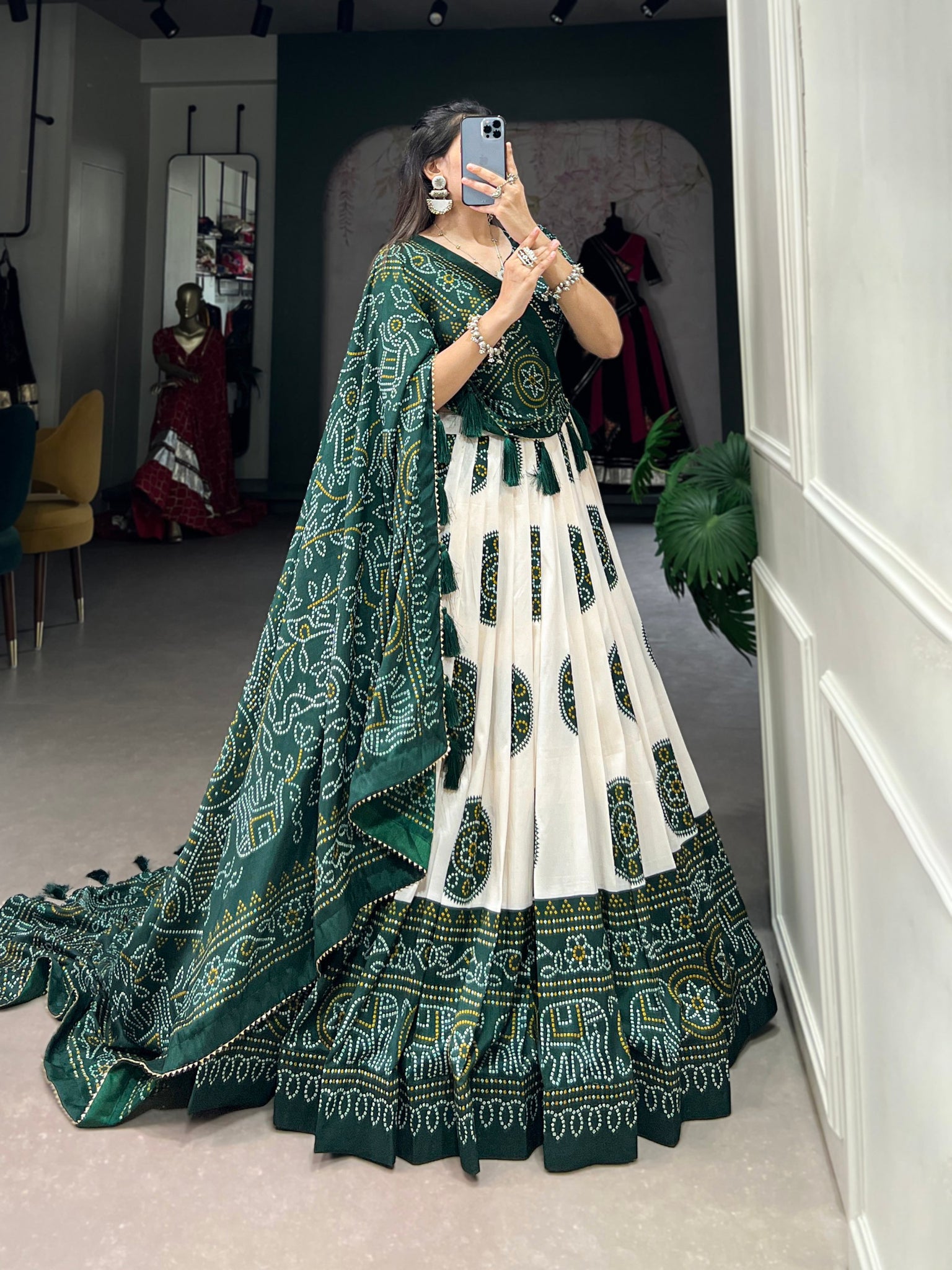 Green Artistry in Silk Tussar Lehenga Choli with Bandhej Print & Gotta Patti Accents