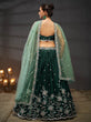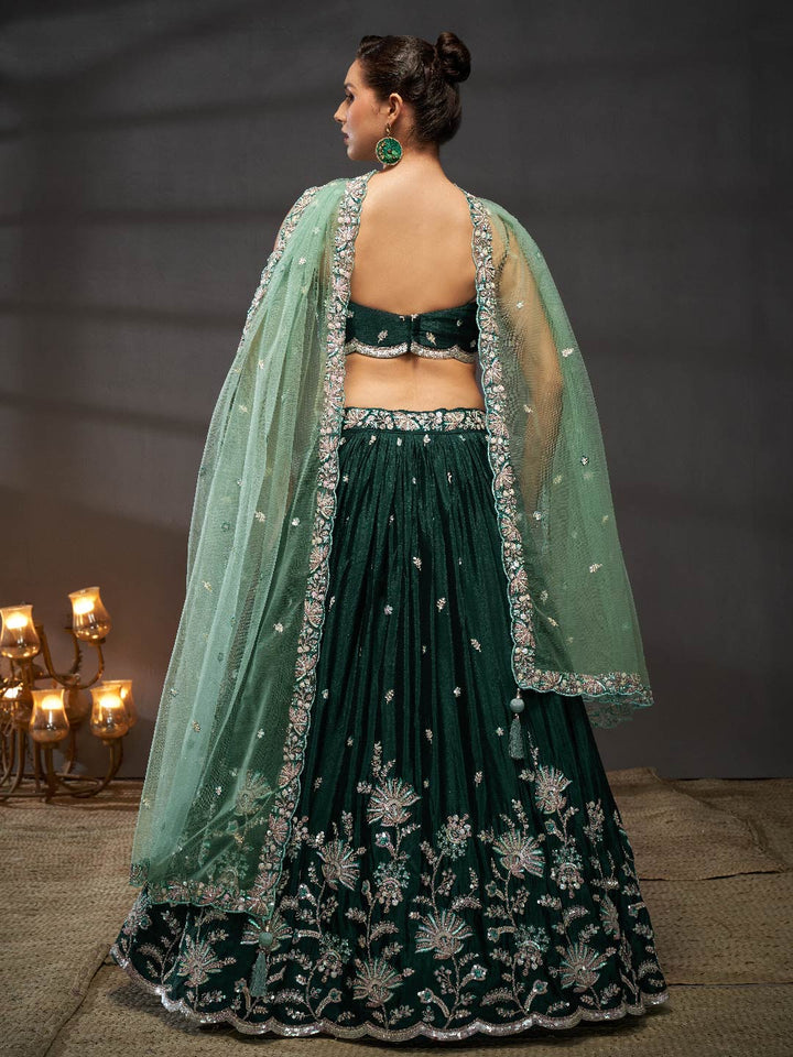 Green Pure Chiffon Semi-Stitched Lehenga Set, beautifully designed for grand occasions. This full-flair lehenga boasts intricate sequins detailing and coding thread embroidery
