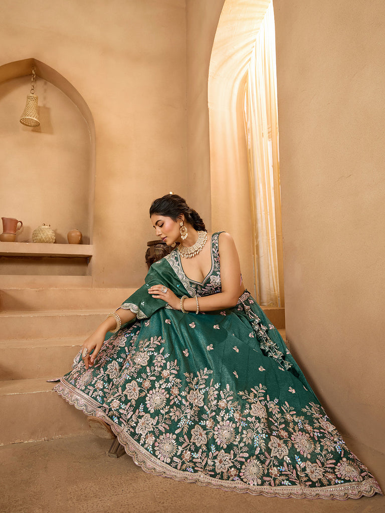 Green Tissue Lehenga Choli Set, designed to make you stand out at any occasion. Crafted from premium tissue fabric, this ensemble is adorned with contemporary sequins, stones, coding work, and intricate thread embroidery, giving it a luxurious and graceful appeal. Perfect for weddings, festive celebrations, or casual gatherings, this lehenga choli strikes the ideal balance between tradition and modern sophistication.