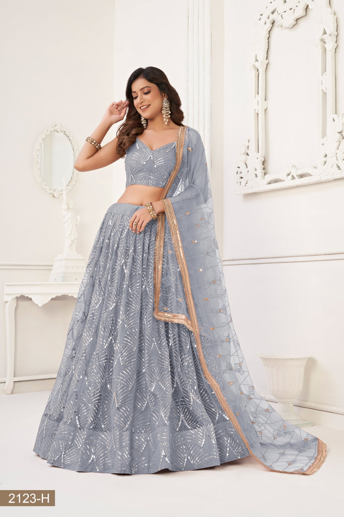Grey Butterfly Net Lehenga with Tone-to-Tone Thread Work and Mirror Embroidery