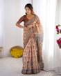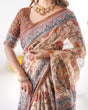 Handloom Linen Cotton Printed Saree with Traditional Mithila Art Pallu – Earthy Beige & Maroon