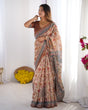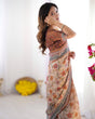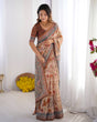 Paired with a complementing maroon floral printed blouse, this saree effortlessly blends rustic charm with regal poise. The subtle golden tassels at the pallu hem add a finishing touch of elegance.