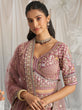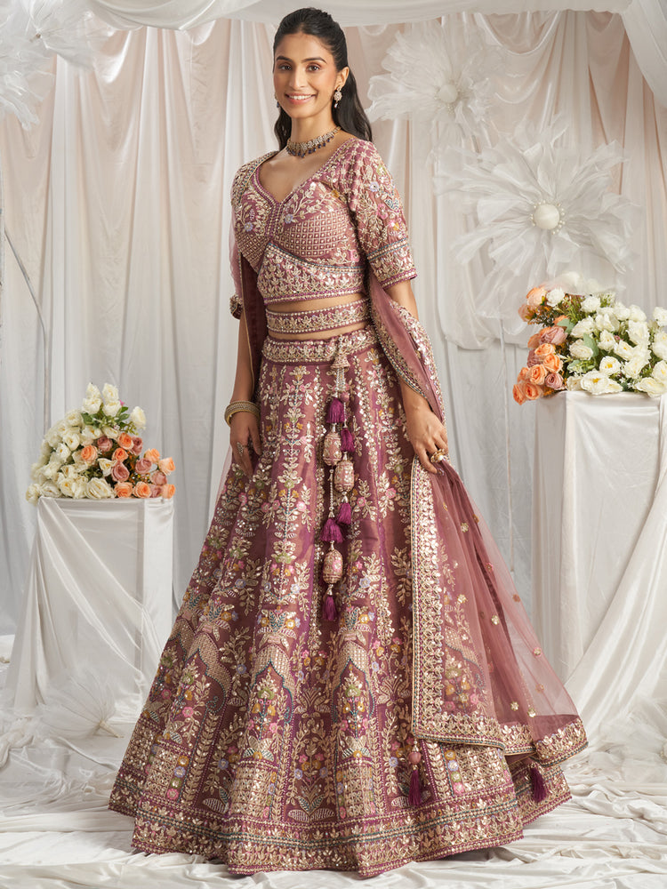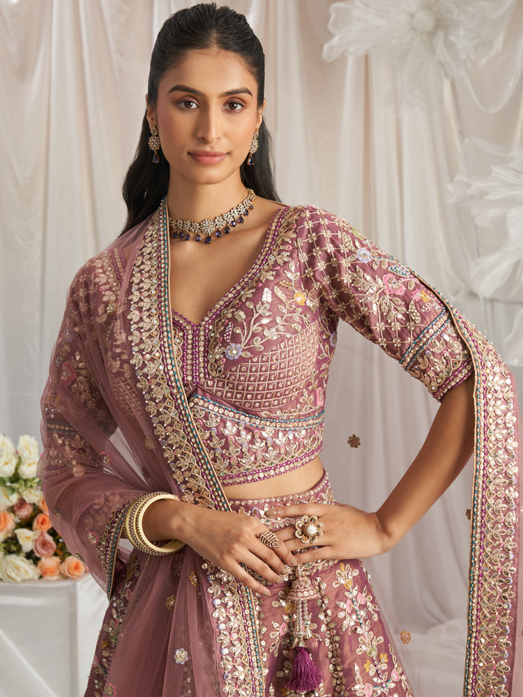 Blouse: The semi-stitched bridal net blouse in lavender features a sweetheart neckline, beautifully adorned with heavy sequins and thread embroidery.