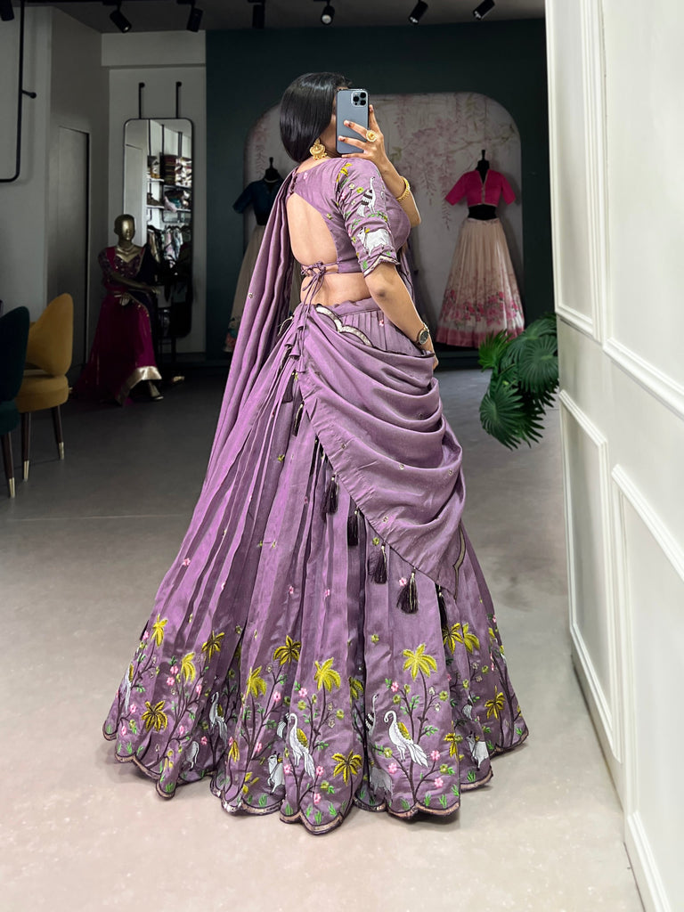 lavender vichitra simmer lehenga set, designed to bring a glow to any special occasion, especially as a bridesmaid. The lehenga features intricate sequins and thread embroidery work, creating a shimmering effect that catches the light beautifully. The waist is supported up to 42 inches, with a flattering length of 41 inches and a voluminous 3.5-meter flair. The canvas and can-can stitching provides extra structure, ensuring you feel both graceful and comfortable. The lehenga is completed with a convenient drawstring and zip closure.
