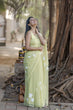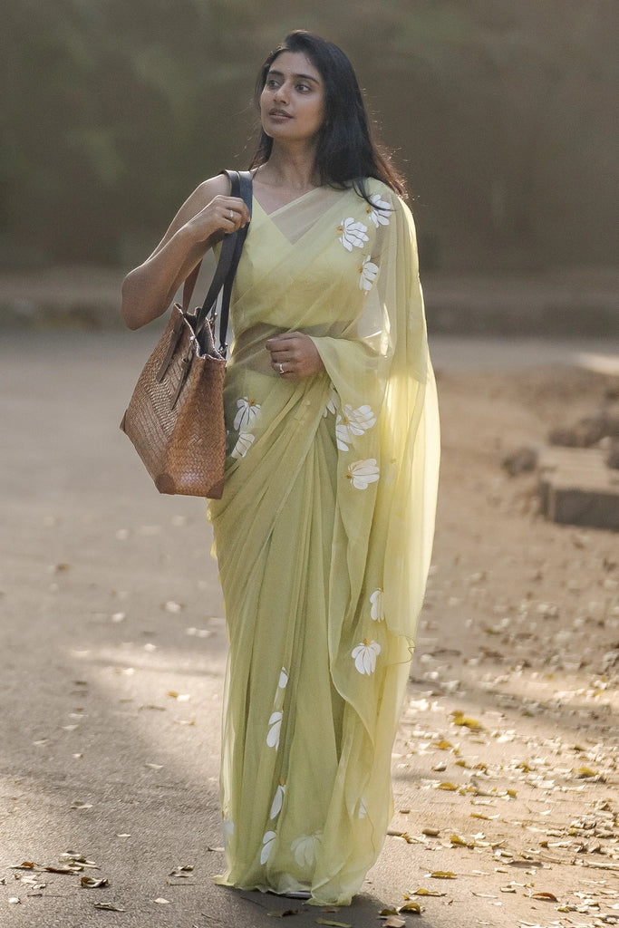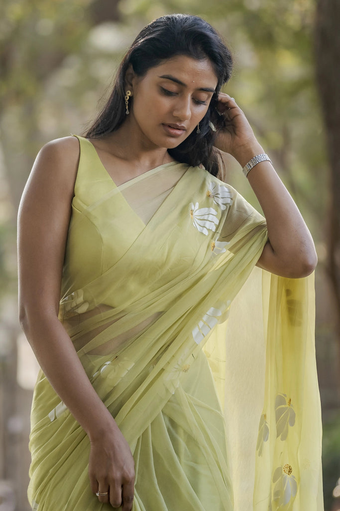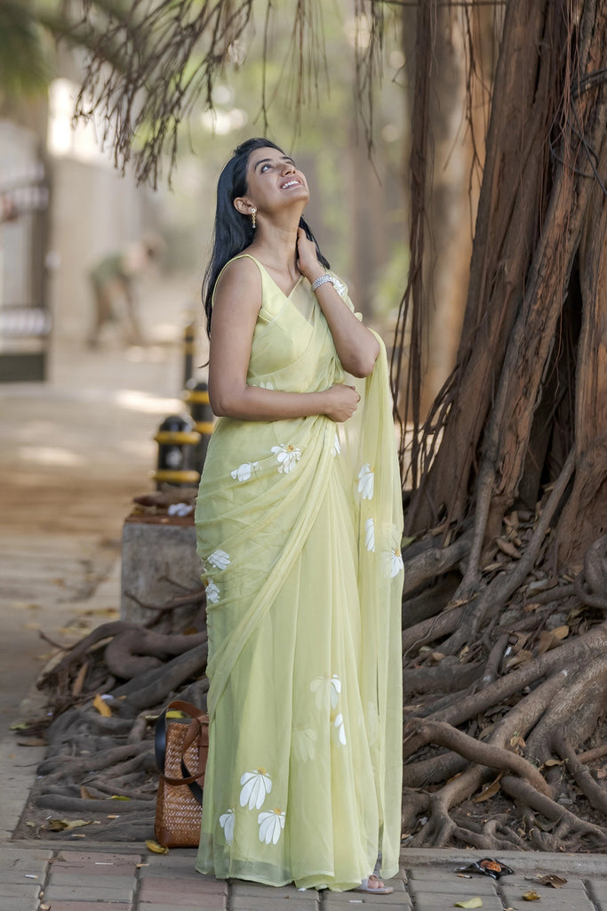 Lemon Yellow Hand-Painted Pure Georgette Saree with White Floral Motifs & Sequin Detailing | Modal Satin Blouse