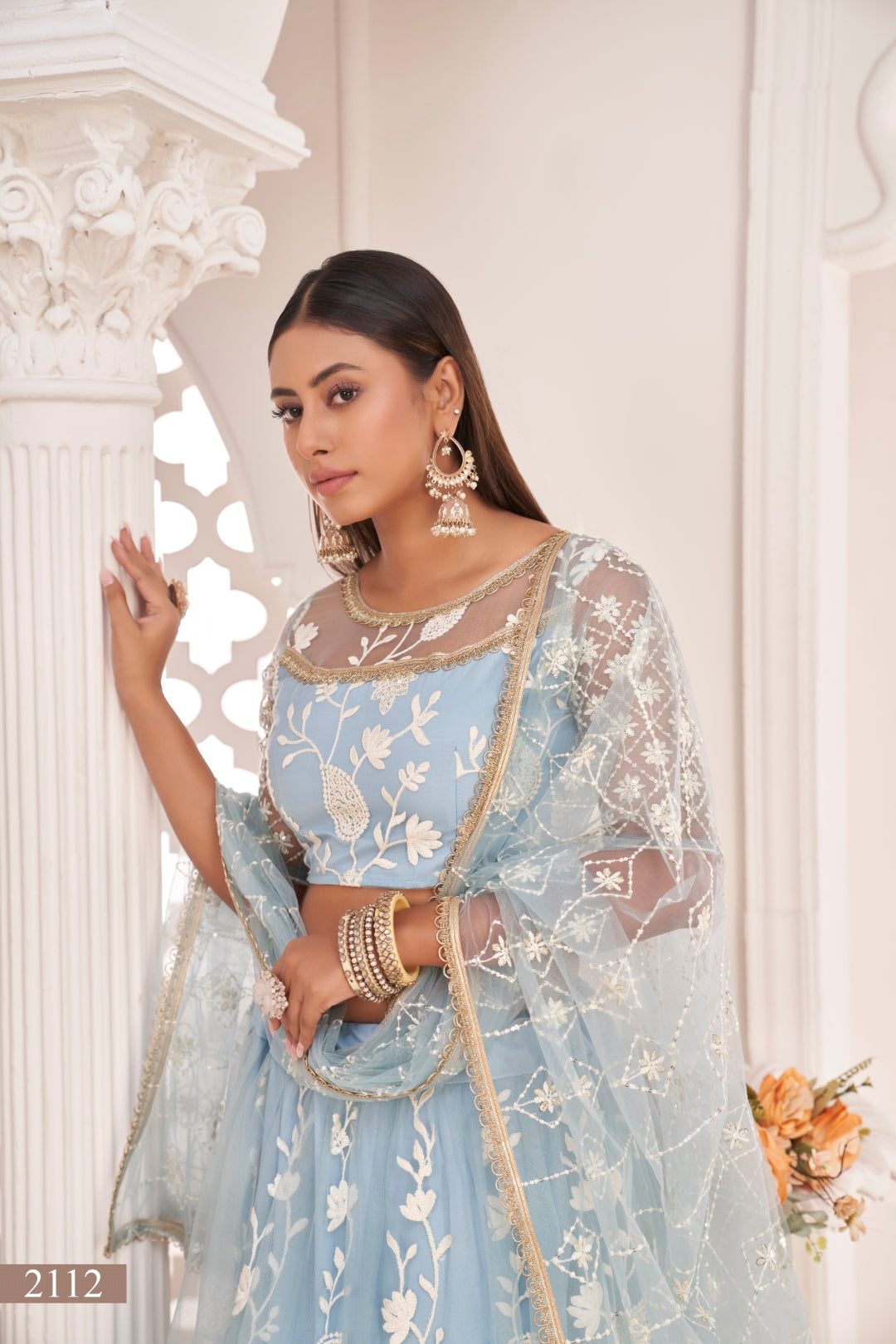 Light Sky Butterfly Net Lehenga, perfect for weddings, festive celebrations, or special occasions. This exquisite ensemble features:
