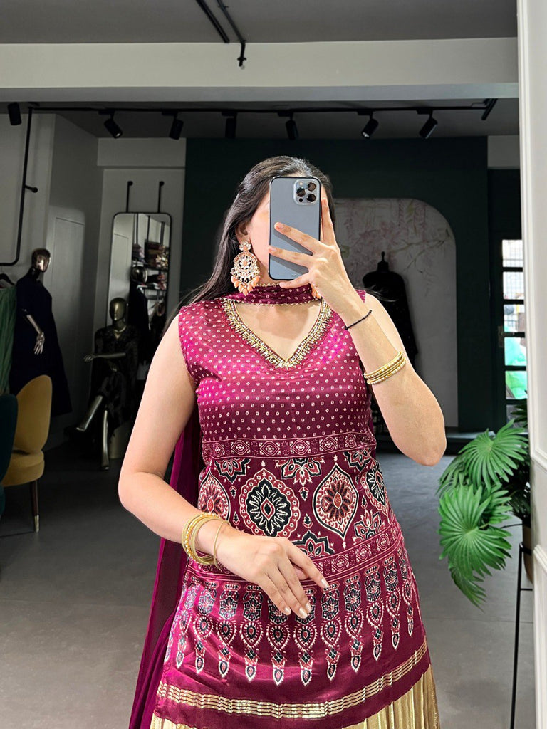 Maroon Gaji Silk Printed & Handwork Kurti Set with Georgette Plazo and Dupatta – Fully Stitched