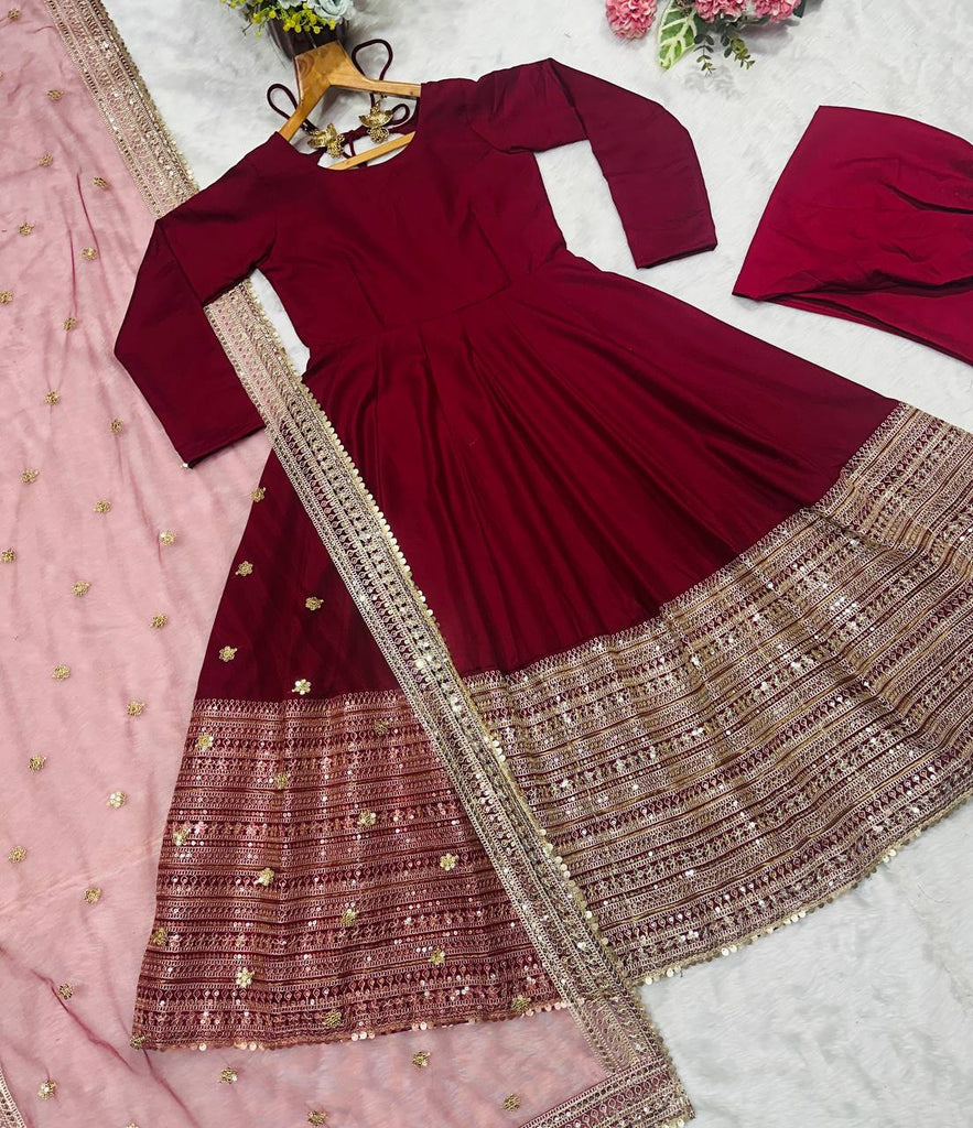 Maroon Rayon Embroidered Kali-Cut Anarkali Top with Micro Cotton Pant & Butterfly Net Dupatta – Heavy Sequins, Thread & Zari Work