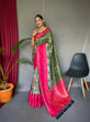 Introducing our stunning Military Green Saree in Bandhej Kalamkari Print, perfect for any special occasion. Made from pure soft silk, this saree features intricate Bandhej Kalamkari prints all over, complemented by a satin woven border and a rich zari woven pallu with tassels. The saree comes paired with a beautiful brocade blouse, adding an extra touch of elegance to your look. With a saree length of 5.5m and a blouse length of 0.8m, this saree is perfect for parties, weddings, and festive occasions. Make a statement with our Military Green Saree in Bandhej Kalamkari Print.