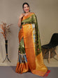 Introducing our stunning Military Green Saree in Floral Kalamkari Print, perfect for any special occasion. Made from pure soft silk, this saree features intricate floral Kalamkari prints all over, adding a touch of elegance and sophistication. The zari woven border and rich woven pallu with tassels add a luxurious touch to the overall design. This saree comes paired with a contrast brocade blouse, completing the look. The saree length is 5.5m and the blouse length is 0.8m, ensuring a comfortable and flattering fit for all body types. Ideal for parties, weddings, and festive occasions, this Military Green Saree in Floral Kalamkari Print is sure to turn heads and make you feel like a true fashionista. Don't miss out on this must-have addition to your wardrobe!