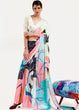 Satin crepe sarees are known to attract eyeballs with their alluring visual texture. Your celebratory evenings call for this one key piece. This alluring multi colored digital printed satin crepe saree is charismatically designed with adorable floral print all over to steal your heart in the first go. Style this beauty with a Potli bag and high heels for a flawless look.