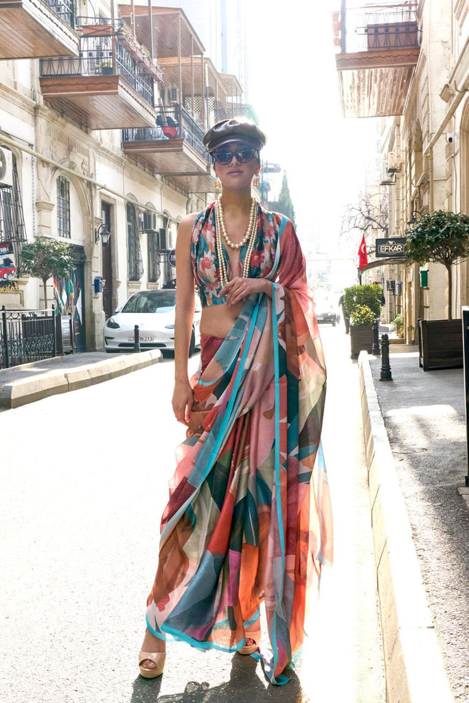 Bollywood-style printed satin saree. Crafted from premium-quality satin, this saree offers a luxurious drape and an elegant sheen, ensuring you stand out in every gathering.