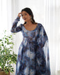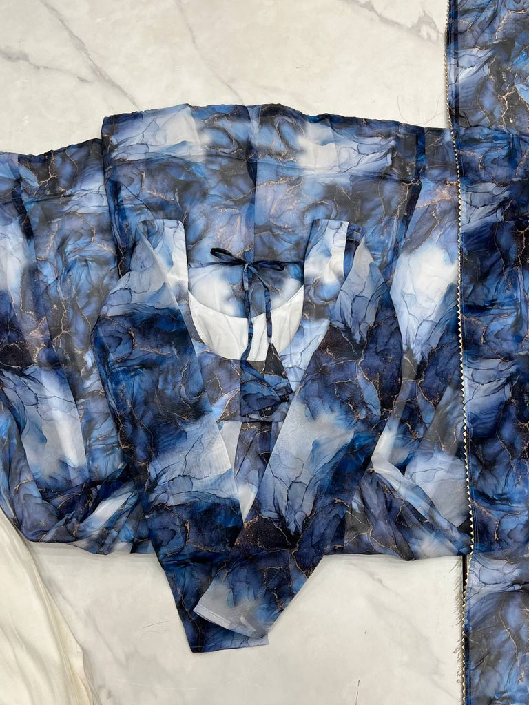Navy Blue Designer Pure Organza Silk Marble Print Anarkali Set with Dupatta & Pant