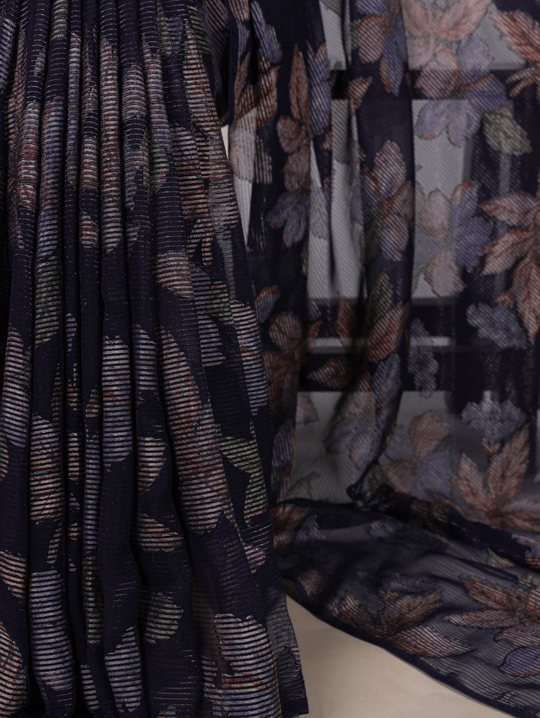 Navy Blue Floral Lurex Brasso Saree with Unstitched Blouse – Elegant Viscose Brasso Work