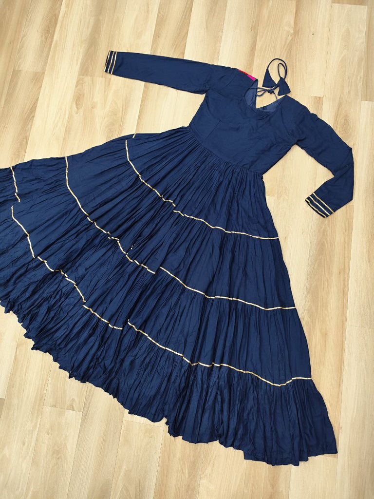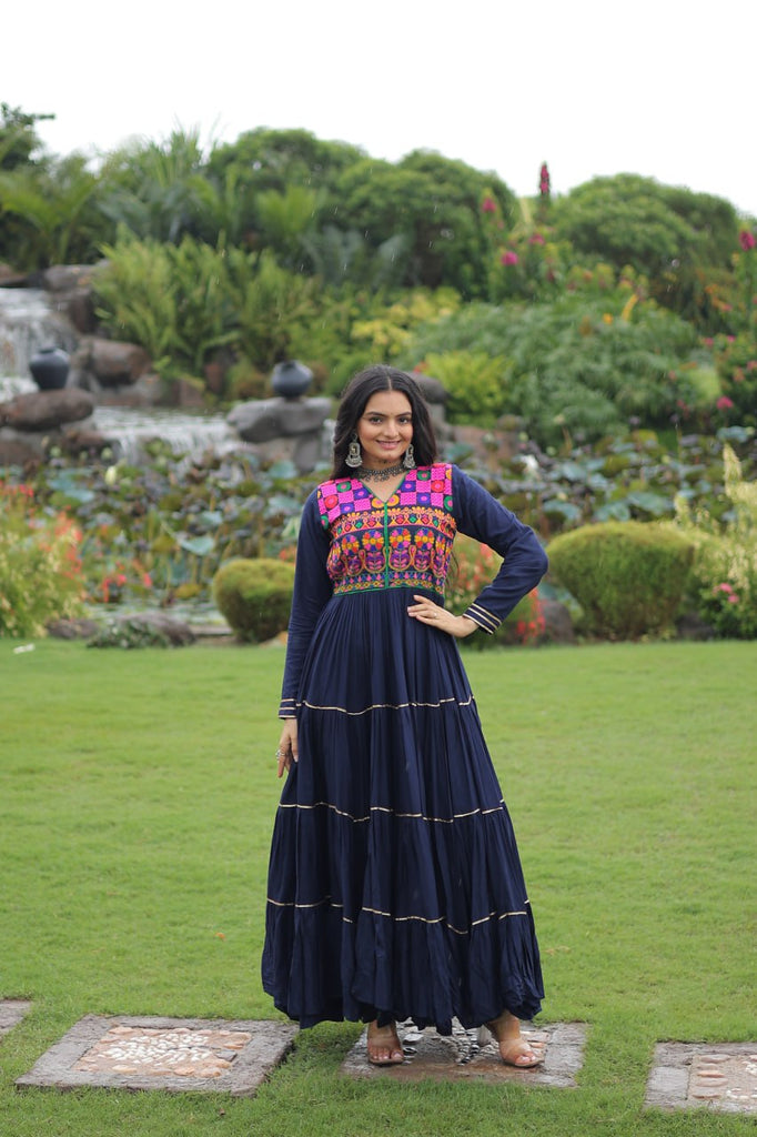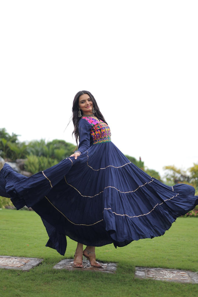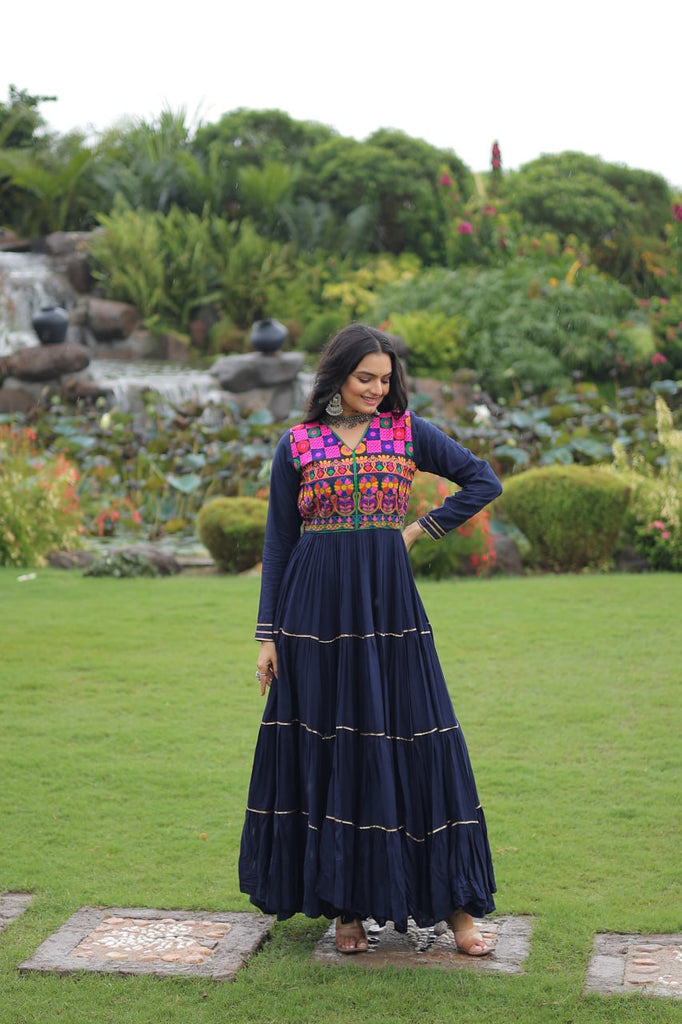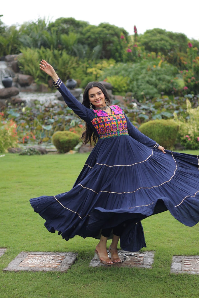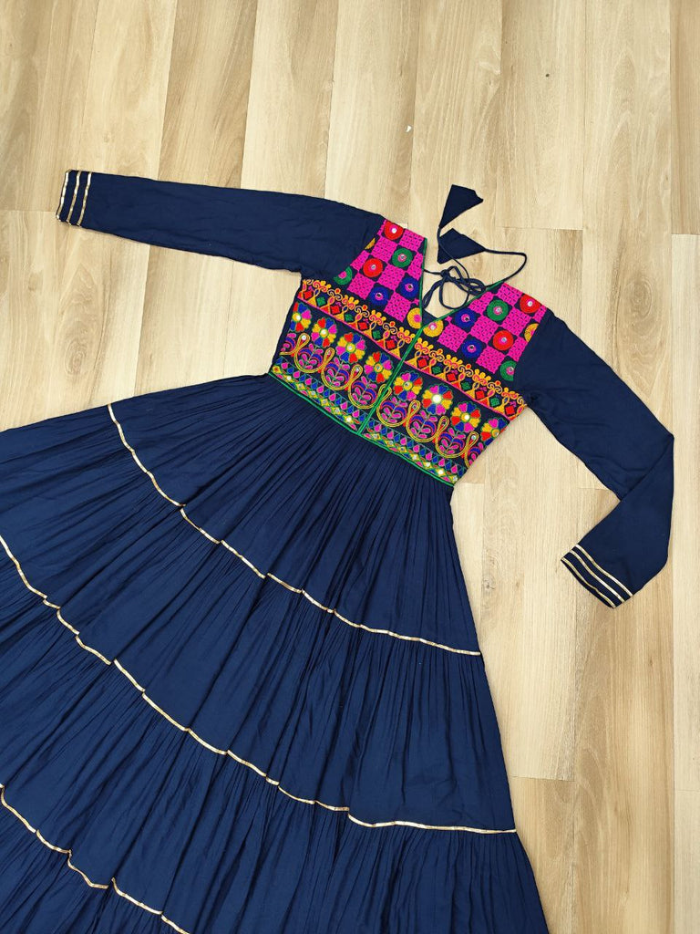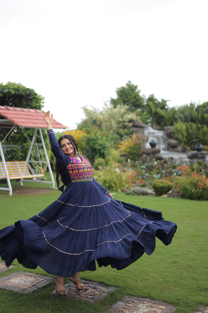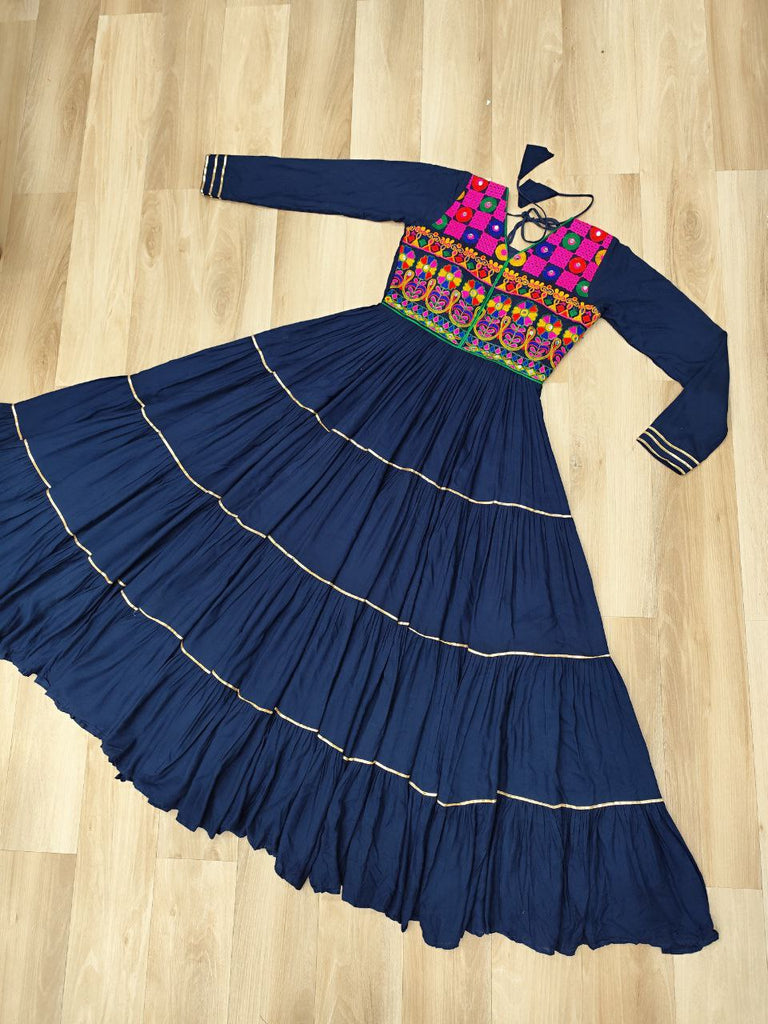 Navy Blue Navratri Special 14 Kg Reyon Gown with Kutchi Gamthi & Mirror Hand Work – 4-Layer Frill, 10+ Meter Flair