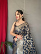 Introducing our stunning Navy Blue Saree in Cotton Linen, the perfect symbol of elegance and dignity. This saree is versatile and can be worn for different occasions, making it a must-have in your wardrobe. The saree is beautifully designed with gold jaal design zari weaving all over, giving it a rich and luxurious look. The saree also features a rich zari woven pallu, adding to its elegance. The saree comes paired with a brocade blouse, completing the look. The saree length is 5.5m and the blouse length is 0.8m, making it a perfect fit for most body types. This saree is perfect for parties, weddings, and festive occasions. Make a statement with our Navy Blue Saree in Cotton Linen and be the center of attention at any event.