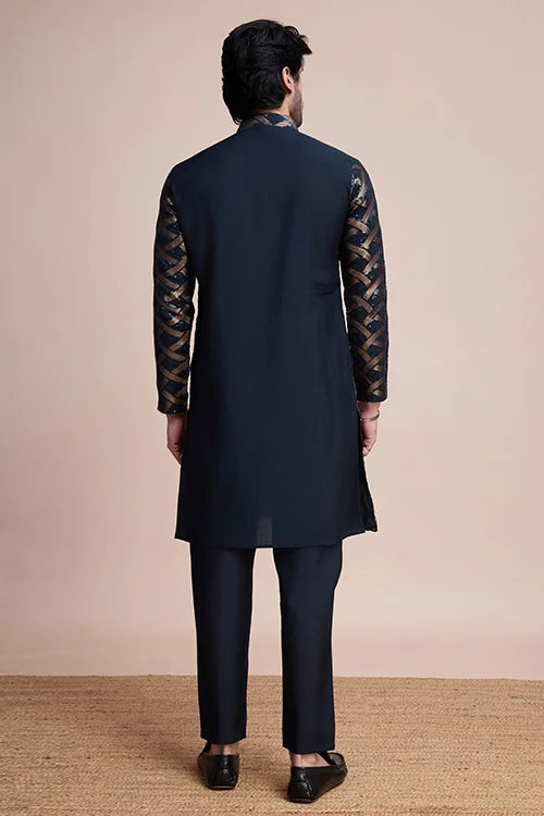 Elevate Your Wardrobe With Our Navy Silk Men's Kurta. It's Designed for Special Occasions Like Weddings, Festivals, and Grand Celebrations. Made From Premium Fabric, This Offers a Luxurious Sheen, Smooth Texture, and Unmatched Comfort.This Kurta is a Fashion Statement and a Symbol of India's Rich Heritage, Blending Tradition and Style Seamlessly.