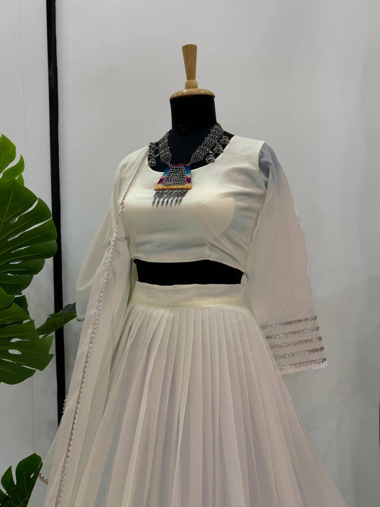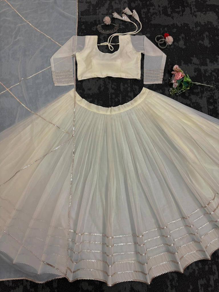 Off White Elegant Tabby Organza Semi-Stitched Lehenga Set with Digital Print & Lace Border