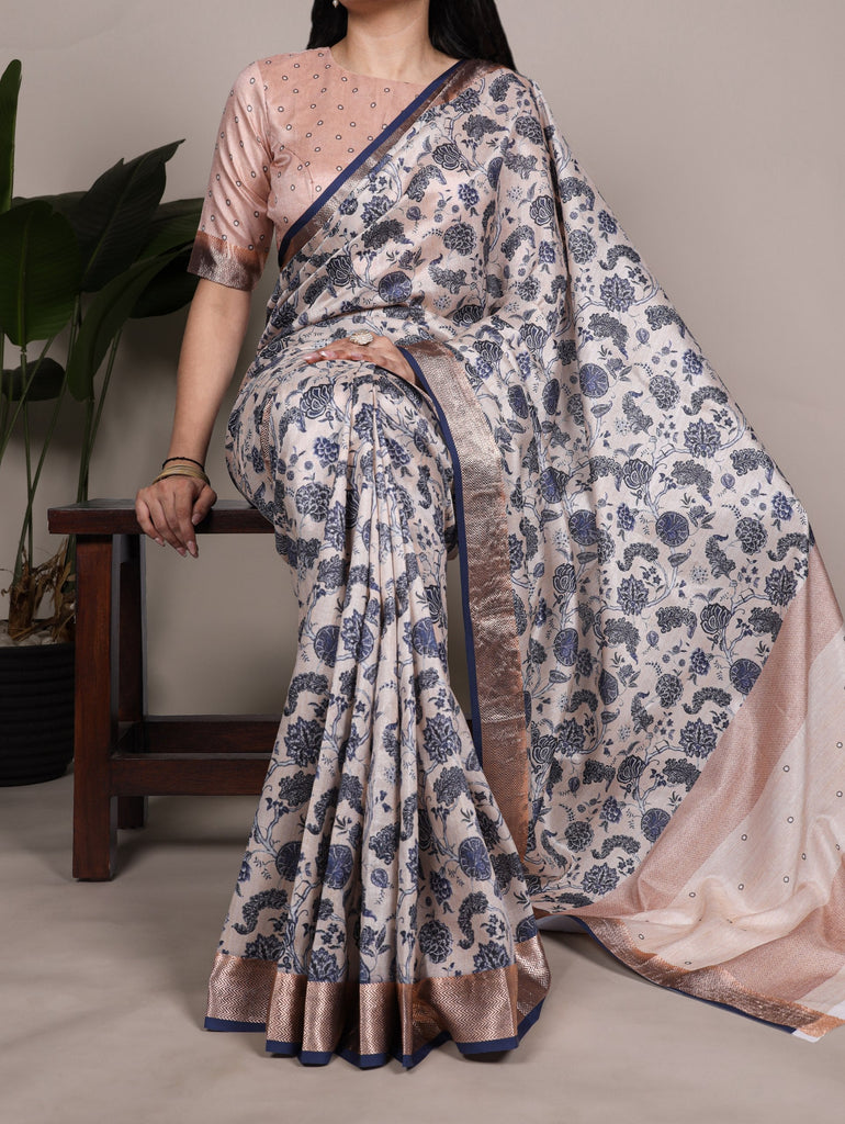 Off White Elegant Tasar Silk Printed Saree with Viscose Border & Matching Unstitched Blouse – Premium Traditional Party & Festive Wear