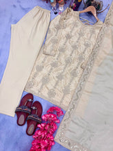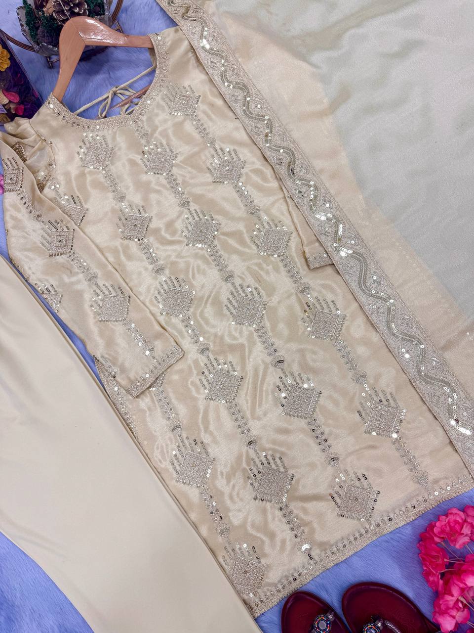 Off White Premium Designer Party Wear Chinon Silk Top, Bottom & Dupatta Set