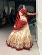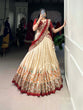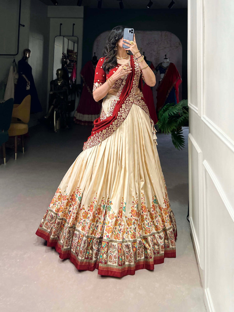 Off White Tussar Silk Printed Lehenga Set with Embroidered Vichitra Silk Blouse & Dupatta