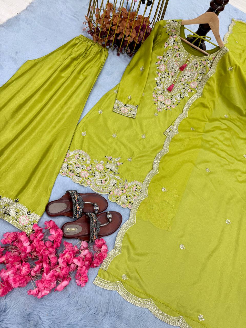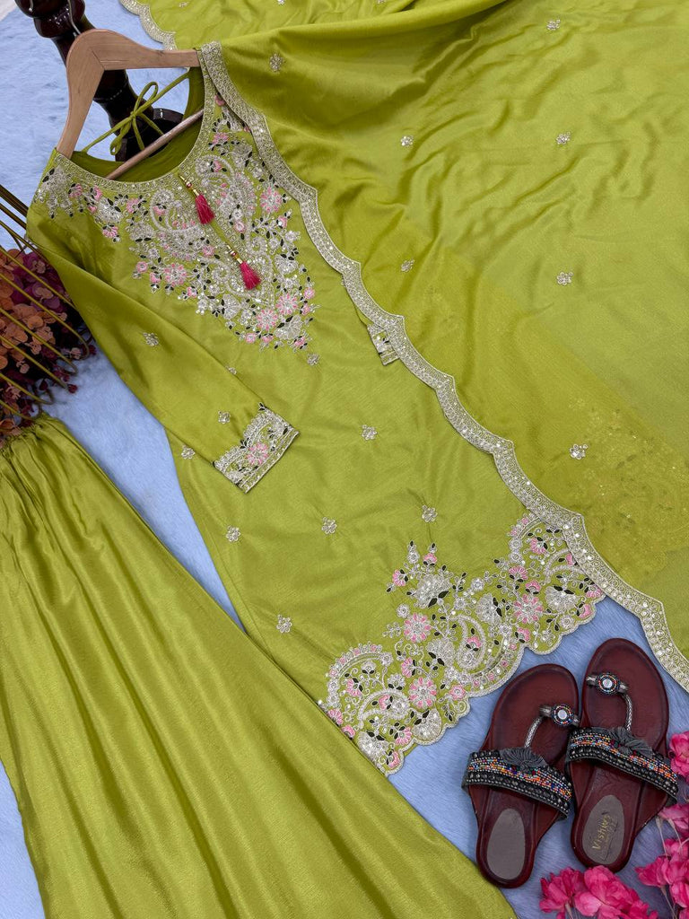 Parrot Green Premium Designer Chinon Silk Party Wear Top, Plazzo & Dupatta Set