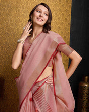 s elegant solid-colored saree, beautifully enhanced with a shimmering zari border. Designed for effortless grace, this saree is crafted from a premium linen blend, offering a luxurious feel with a touch of tradition. The intricate zari detailing adds a festive charm, making it perfect for special occasions.