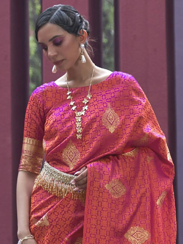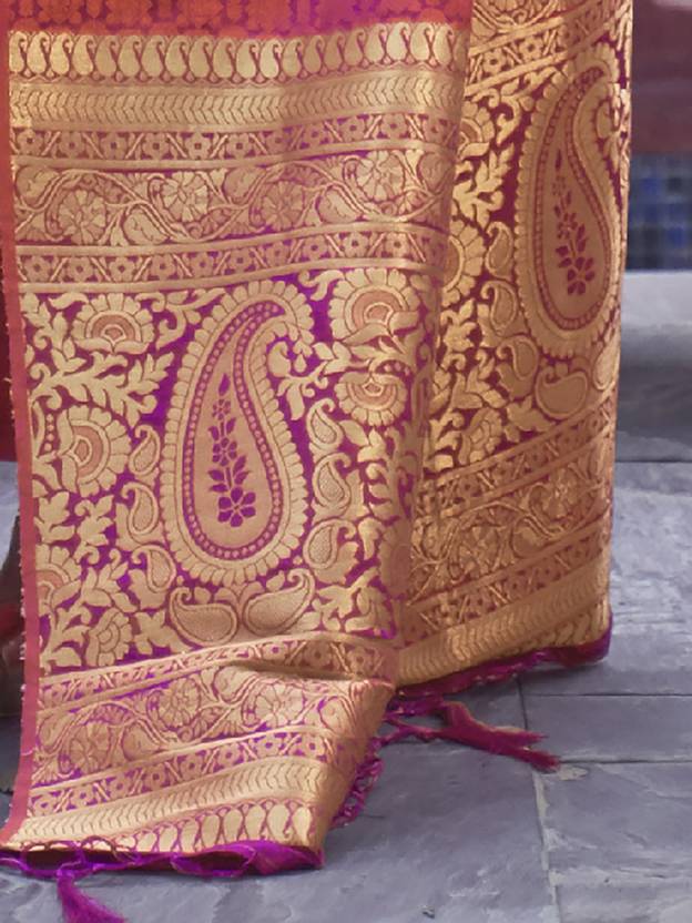 Radiate timeless elegance with this exquisite Banarasi saree, crafted from pure silk and adorned with intricate woven patterns. Designed for weddings and festive occasions, this 5.5-meter saree exudes grace and grandeur. It comes with a 0.8-meter unstitched blouse piece, allowing you to tailor it to your unique style. For best results, dry clean for the first wash and hand wash thereafter to preserve its luxurious charm. A must-have for any traditional wardrobe, this saree blends heritage with sophistication.