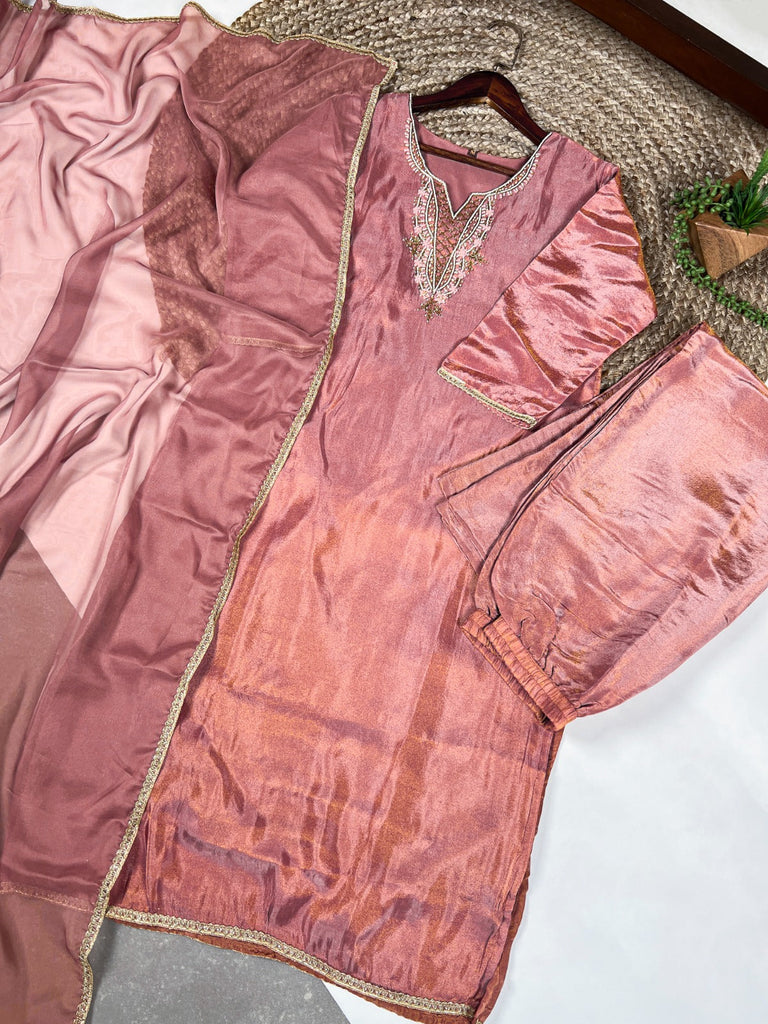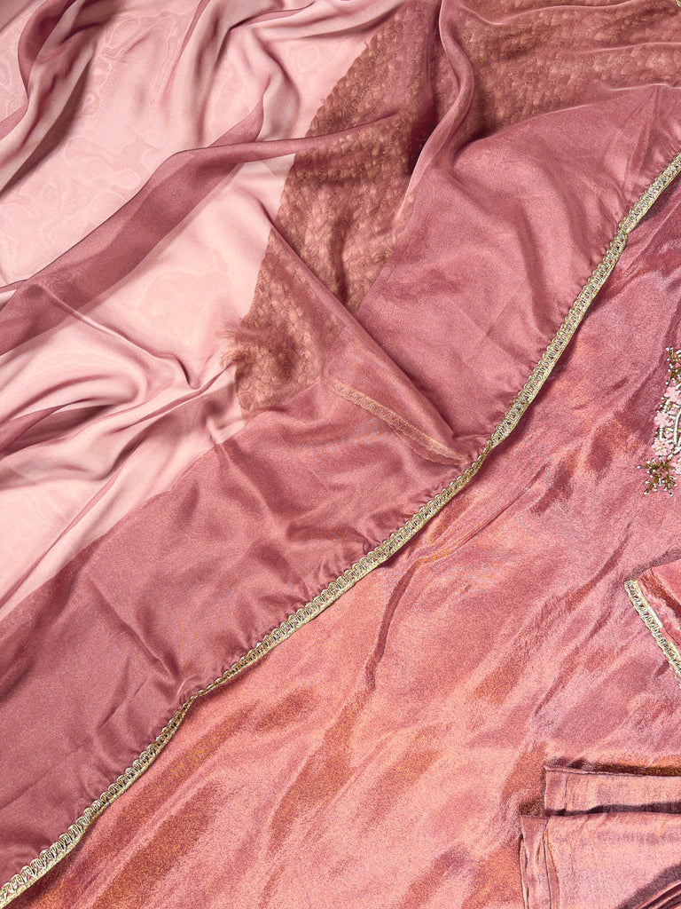 Peach Viscose Tissue Handworked Kurti Set with Organza Dupatta