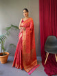Introducing our stunning Peach with Pink Saree in Patola Silk for women. This saree is crafted with the finest Patola silk and features elegant meenakari weaves all over the body of the saree, giving it a unique and sophisticated look. The saree is further enhanced with a beautiful gold zari contrast woven border that adds a touch of glamour to the overall design. The saree also comes with an elegant Zari Woven Pallu that adds a touch of elegance to the overall look. With a saree length of 5.5m and a blouse length of 0.8m, this saree is perfect for any occasion, be it a party, wedding or casual event. Make a statement with this beautiful Peach with Pink Saree in Patola Silk for women.