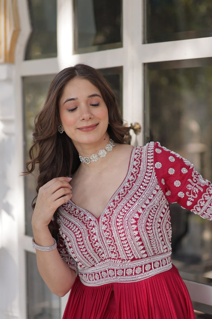 Star Georgette Kurti and Lehenga set, a perfect blend of grace and glam. The embroidered Kurti is adorned with beads and sequins work, featuring a stylish pan-shaped neckline, half sleeves, and a grand 4-meter flair. Designed for comfort and elegance, it comes with a full cotton lining and a flattering 54-inch length