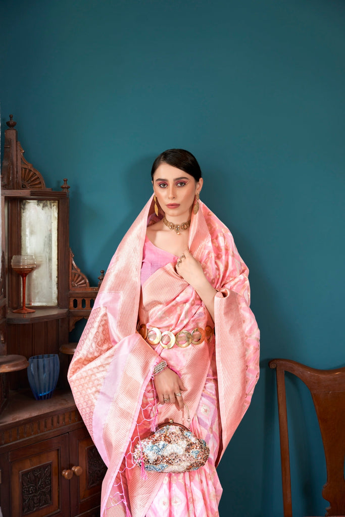Pink & Gold Elegant Banarasi Saree with Geometric Zari Weaving