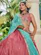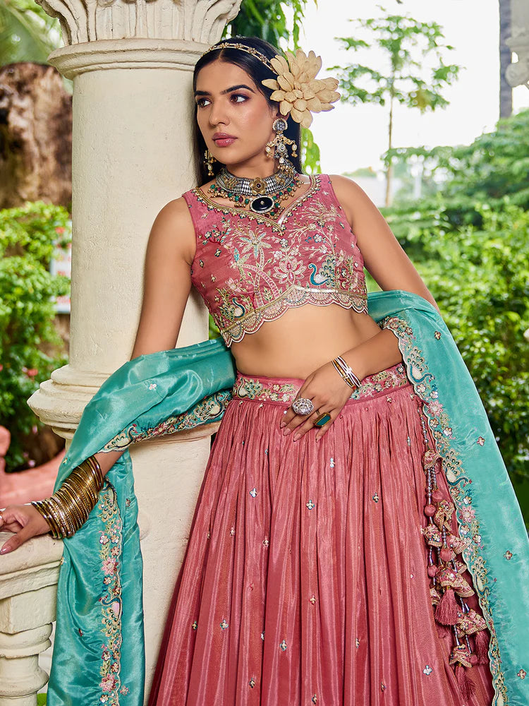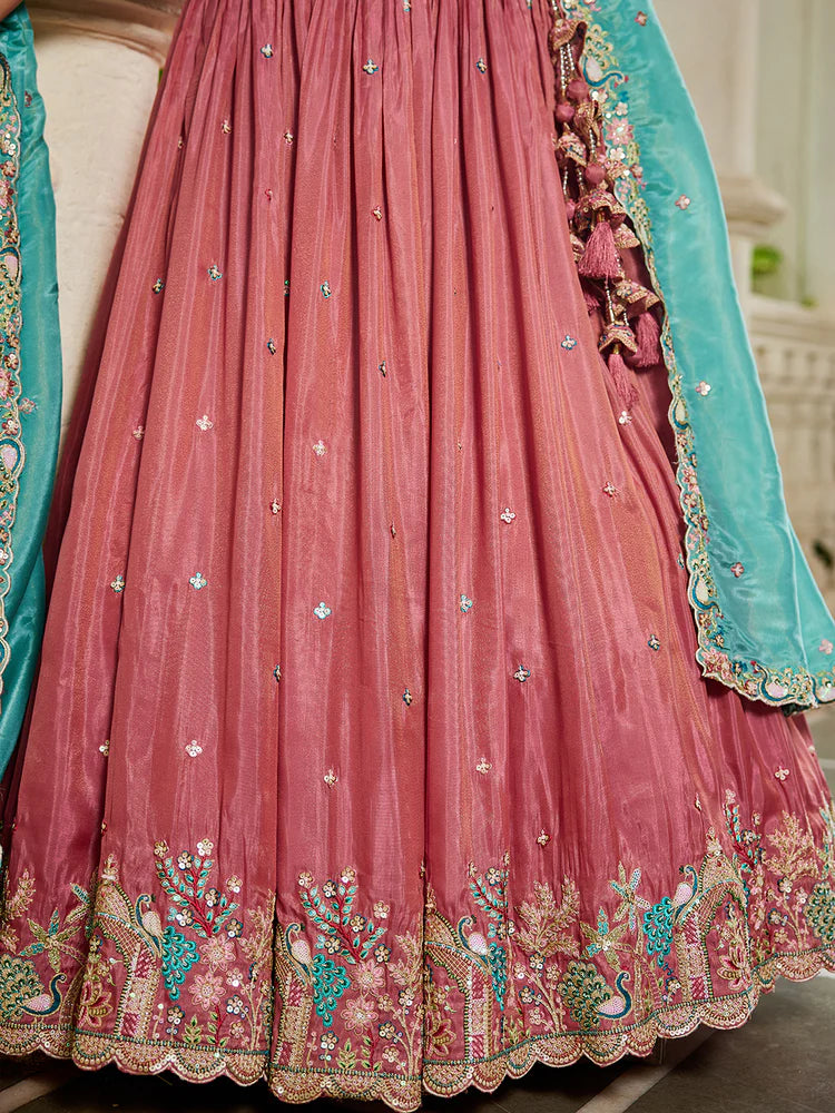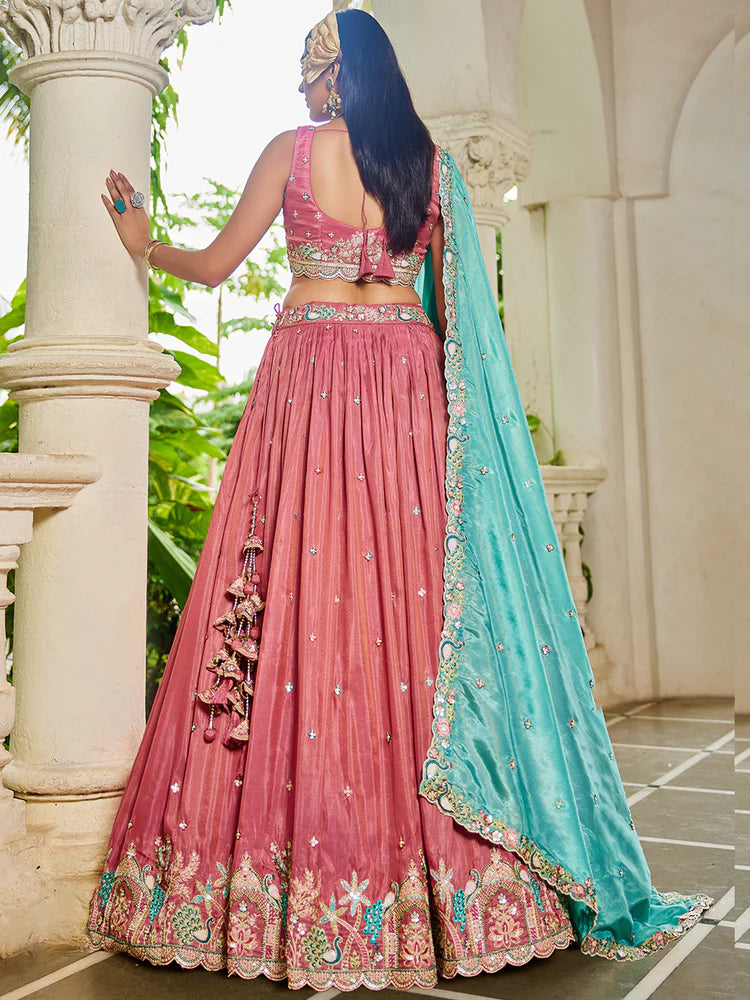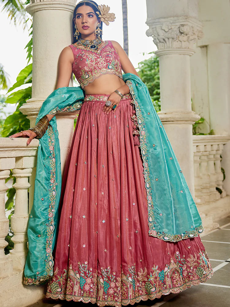Pink Golden Satin Lehenga Choli Set with Embroidered Dupatta Indian Bridal Outfit