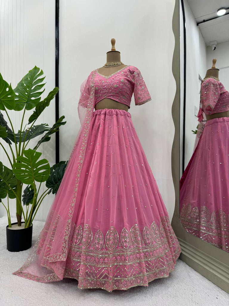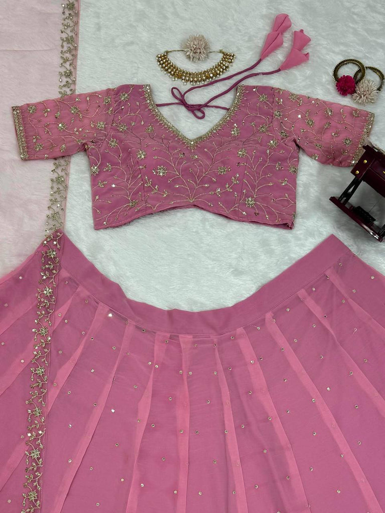 Pink Graceful Faux Georgette Semi-Stitched Lehenga Choli Set with Embroidered Butterfly Net Dupatta
